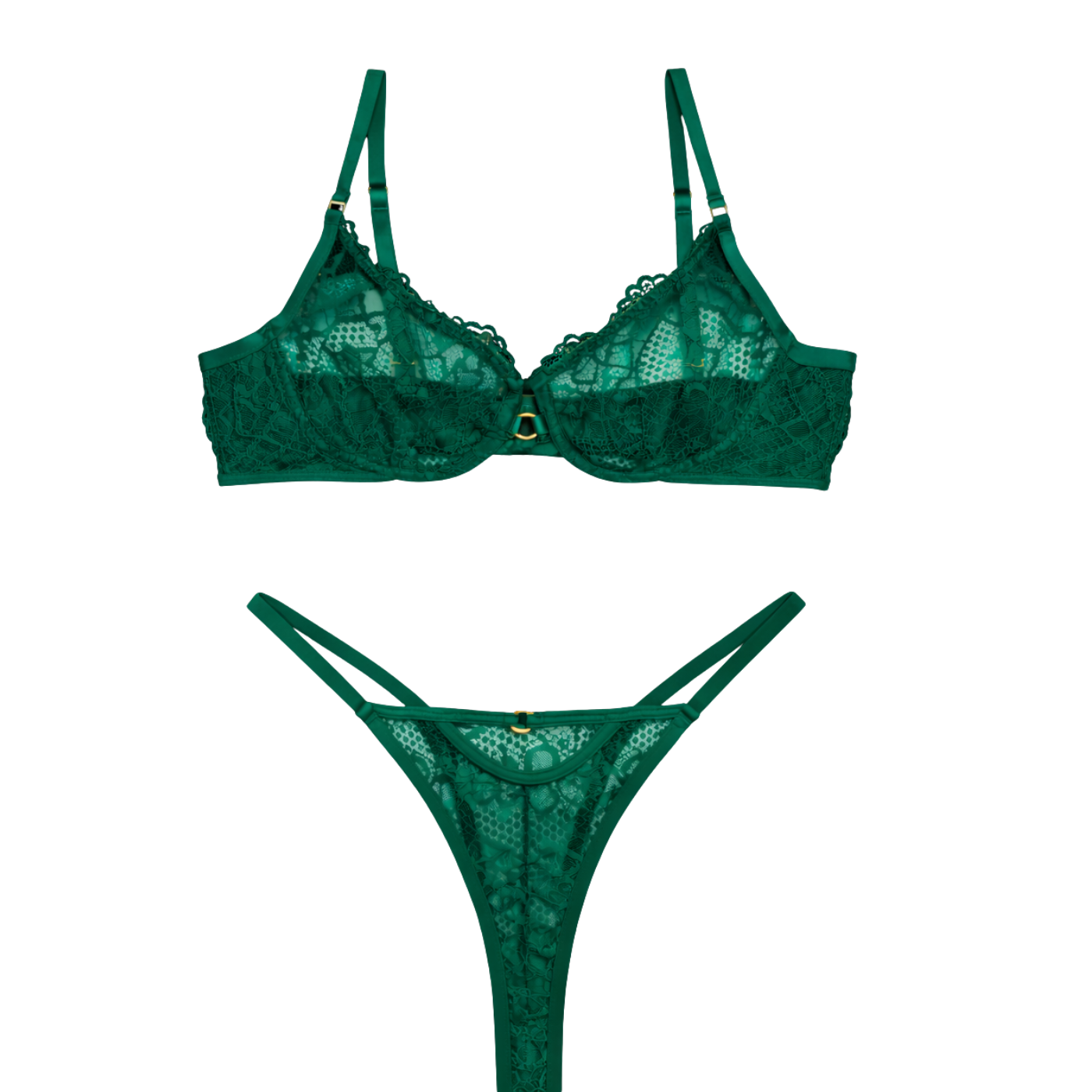 Sa teinte vert émeraude profonde apporte une touche luxueuse et envoûtante, idéale pour celles qui aiment se sentir féminines, confiantes et élégantes. Le soutien-gorge épouse naturellement la poitrine, tandis que le string assorti souligne les courbes avec finesse et modernité.